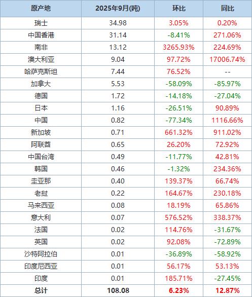 新加坡是第二大出口目的地,当月对新加坡出口白银8.49吨,环比减少24.21%,同比上升91432.32%。
