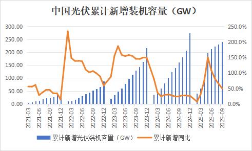 2025年1-9月累计新增光伏装机规模240.27GW,9月单月光伏新增规模9.66GW,环比增长31.35%,同比下降53.76%。“5.31抢装潮”过后,6-8月新增光伏装机容量回落明显,9月光伏装机小幅回升。