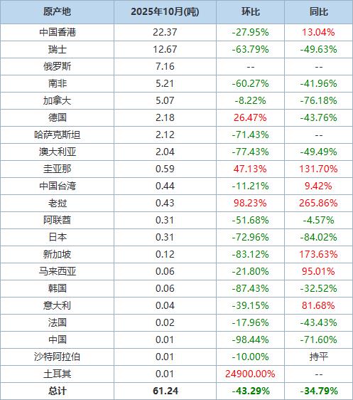 中国香港是最主要来源地,当月从中国香港地区进口黄金22.37吨,环比下降27.95%,同比上升13.04%。
